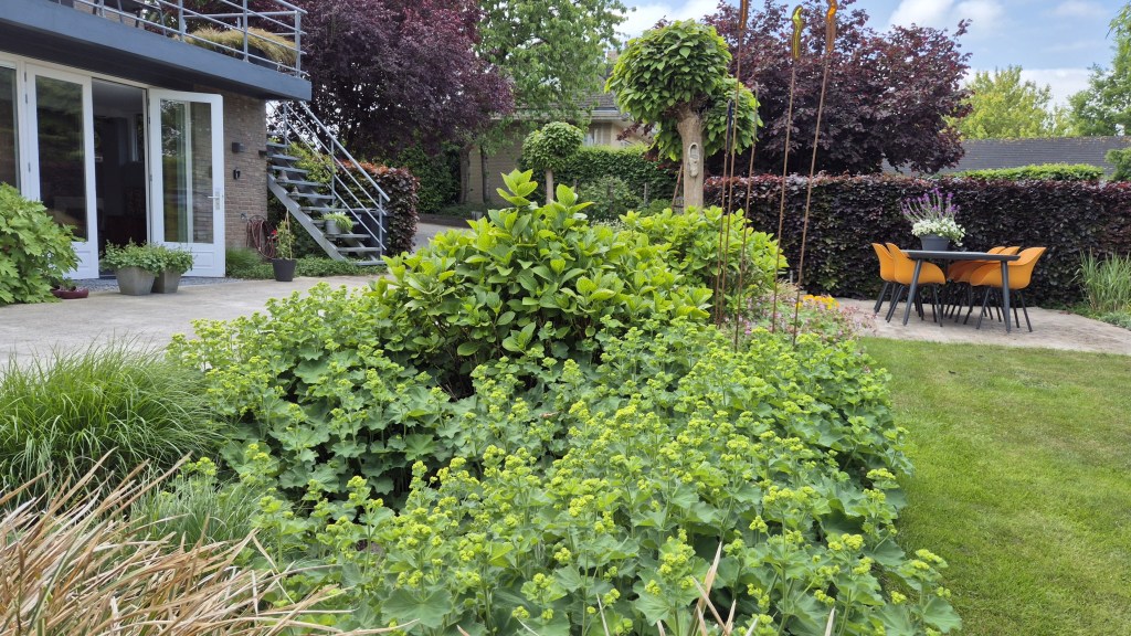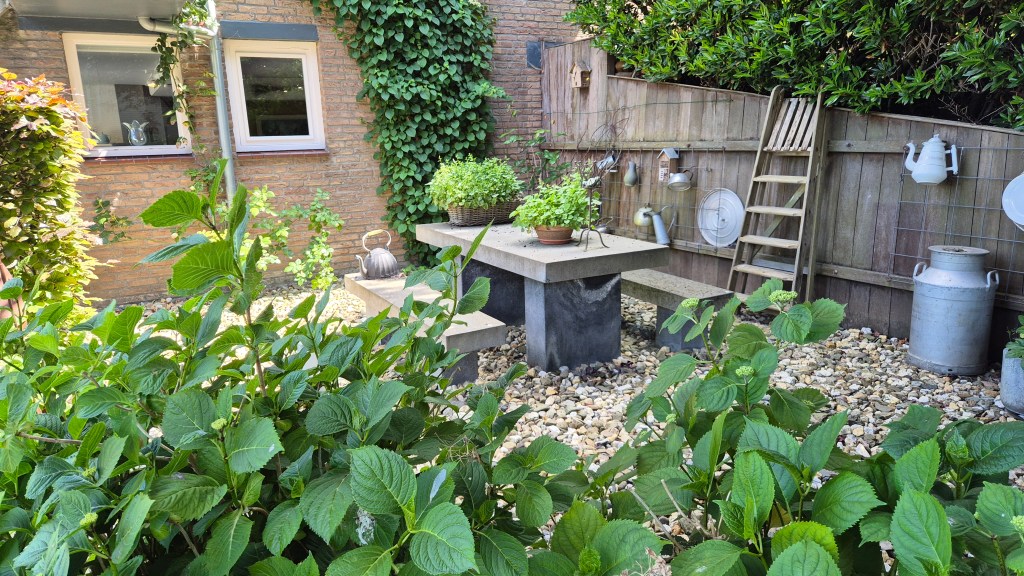 Direct naast het appartement is een terras met picknicktafel en dit terras is afgeschermd door mooie hortensia´s. Bij het appartement is nog een terras in de tuin waar een tuintafel staat met stoelen waar je een spelletje kunt doen of een maaltijd kan nuttigen. Op dit terras wordt je verrast door het zicht op een mooie tuin met bloemen en planten en het gekwetter van de vogeltjes.